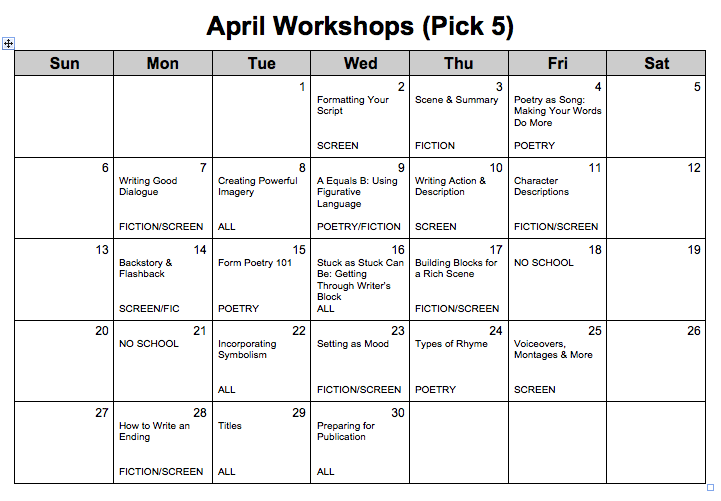 In April, in Creative Writing, we’ve taken a detour from technique-driven units of study. Students are participating in a National Novel Writing Month-inspired challenge, choosing from one of the following writing projects: 30 poems in 30 days, a novel (10,000 words minimum), a screenplay (45 pages minimum).