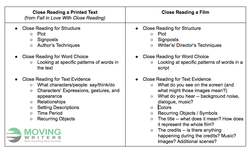 While I didn’t want to delve into the language of film criticism and camera angles, students needed help knowing what they could talk about in a film beyond the simple plot. Sure, they could identify a theme, but what should their evidence look like?