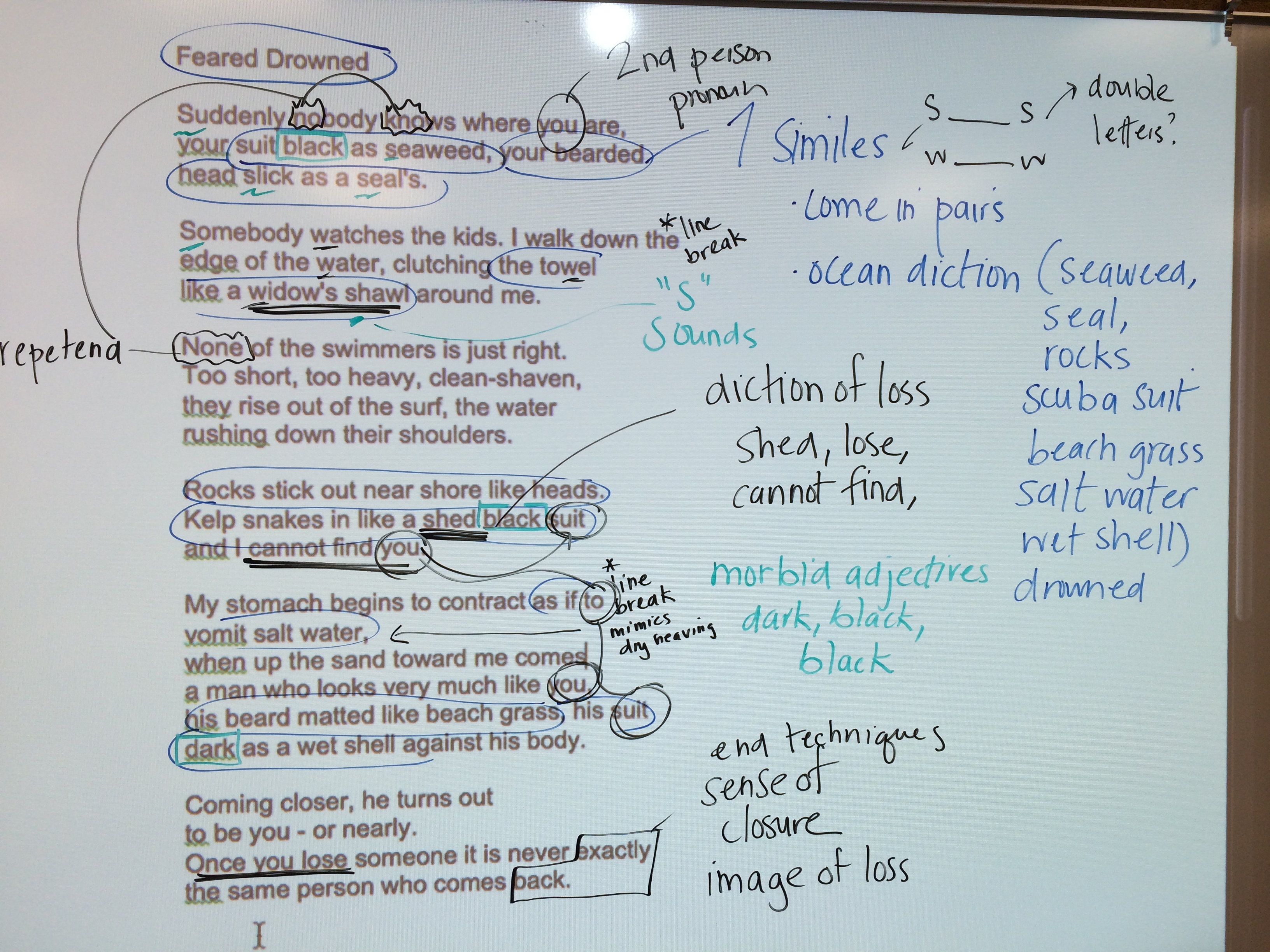 I projected a poem with which I was familiar but had never done a close reading of– “Feared Drowned” by Sharon Olds. I thought aloud as I searched for evidence myself, then invited students to help me find more.