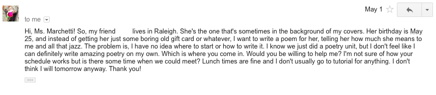 Then, a few days later, I received an email from a current student who wanted help writing a poem for her friend.