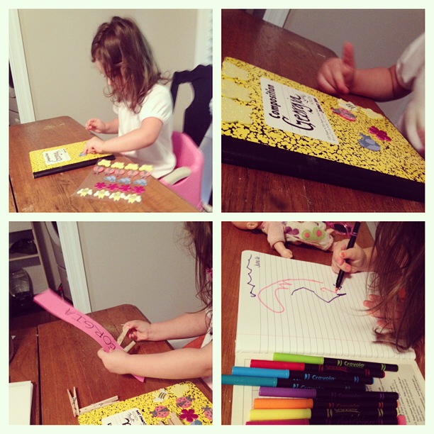 This summer, I constantly fought the impulse to insist my daughter use her notebook in the way I envisioned. My blood pressure shot up when she would want to color on two (or three! or four!) pages instead of just one in order to tell her story. I would get anxious when she left one story unfinished before moving on to another or change stories midstream. I’m just that uptight. With the possessive truth of a three-year-old, Georgia consistently reminded me that her notebook was “mine” and I should keep my hands off.