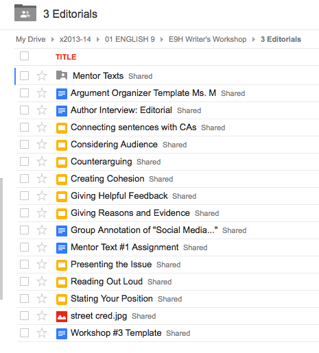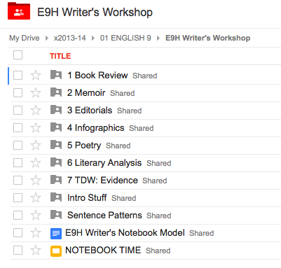 Having this Google Drive back-up system ensures that absent students can find what they need, present students who need reinforcement can check their notes against the class notes, and parents and administrators who want to share in what we’re doing have physical evidence of our journey in writer’s workshop.