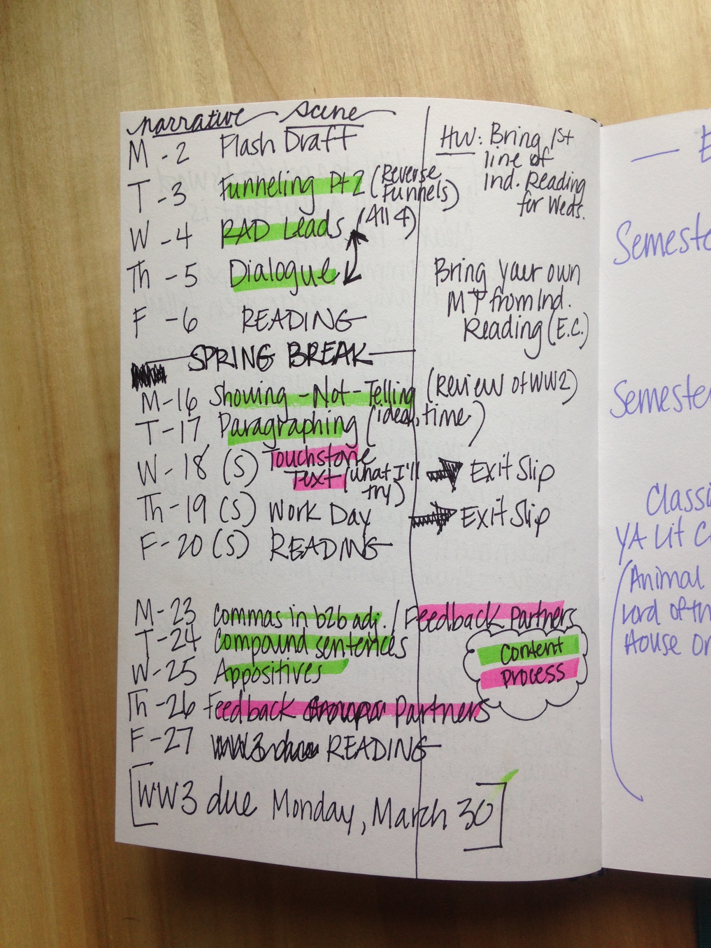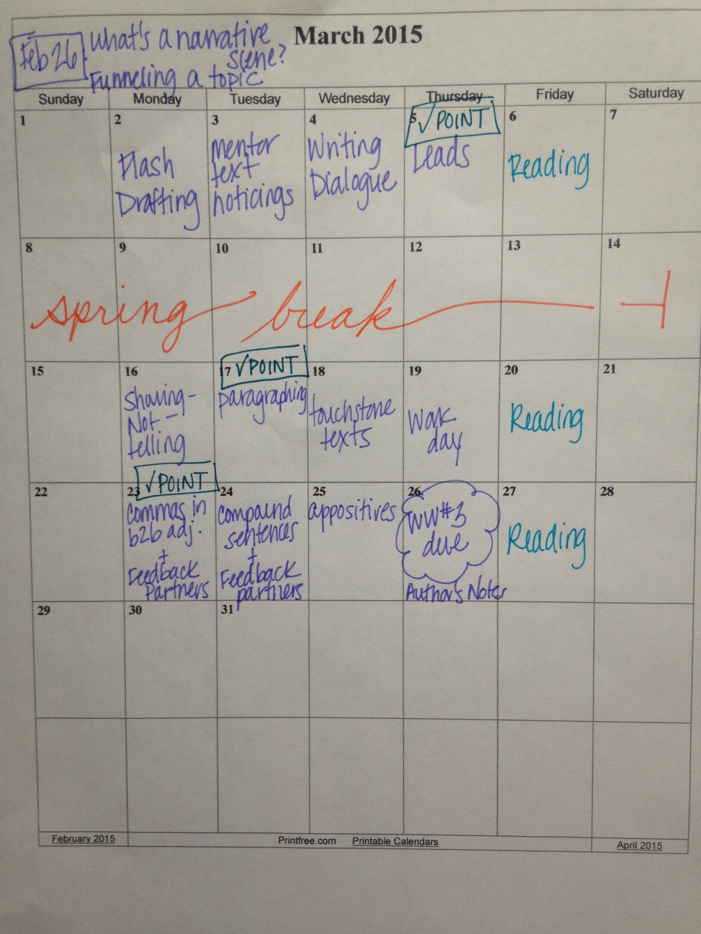 Of course, things happen. Assemblies get scheduled. Snow days happen (and happen, and happen). I have yet to have a calendar work out exactly as planned in advance. Still, this gives me the broad strokes I need to keep the writing study moving at an appropriate pace. It’s a roadmap for knowing where we are headed.