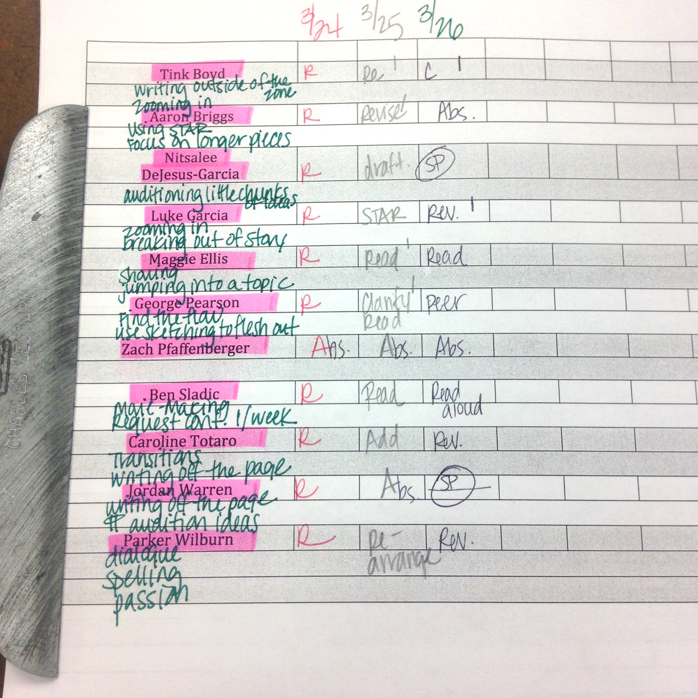 In my portfolio conferences, students’ goals varied widely. Some students made it a goal to break away from the topics toward which they naturally gravitate and to try new things. Other students wanted to specifically focus on their grammar as they progress. Still others made it a goal to request a writing conference with me at least once per week, to intentionally walk through the STAR revision method as they finish pieces of writing, to audition a few ideas before they settle on one. I wrote these goals on my current conferring chart that I carry with me during workshop each day.