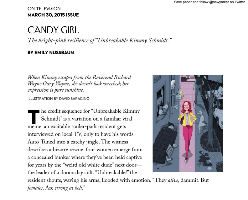 My students love the casual-yet-authoritative style of The New Yorker’s Emily Nussbaum, whose piece “Candy Girl” — a character analysis of Kimmy on Netflix’s Unbreakable Kimmy Schmidt — we studied as a mentor text for their own analytical piece on a character from Cat on a Hot Tin Roof.