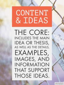 For example, when I confer with students, we can talk about how a piece of writing may be filled with great content and ideas, but that the weak organization holds the piece back. Or we can look at the ways the sentences are varied, but that the overall piece still lacks the details and examples—the content—necessary to support the thesis.