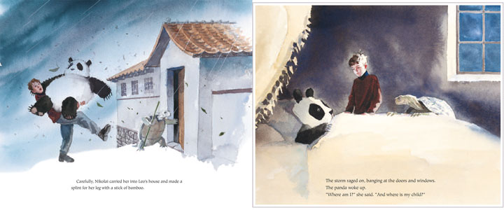 When Nikolai first meets Leo, he finds the old turtle laboring in his garden. Nikolai takes the shovel from Leo to help and continues the digging himself (symbolism!). While he works, a storm rains down, and the two seek refuge. However, Nikolai hears the cries of a hurt Panda nearby. Nikolai drops everything to help the Panda, and there’s a wonderful page depicting Nikolai struggling to carry the too heavy panda inside. When the Panda tells Nikolai that her child is still lost outside, without hesitation, Nikolai braves the storm and ultimately reunites mother and child.