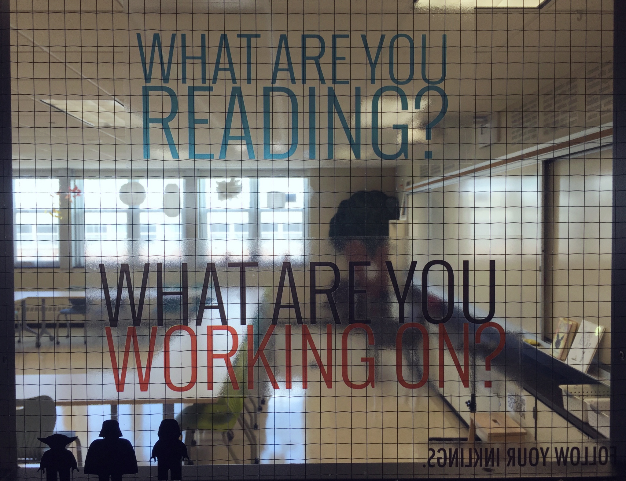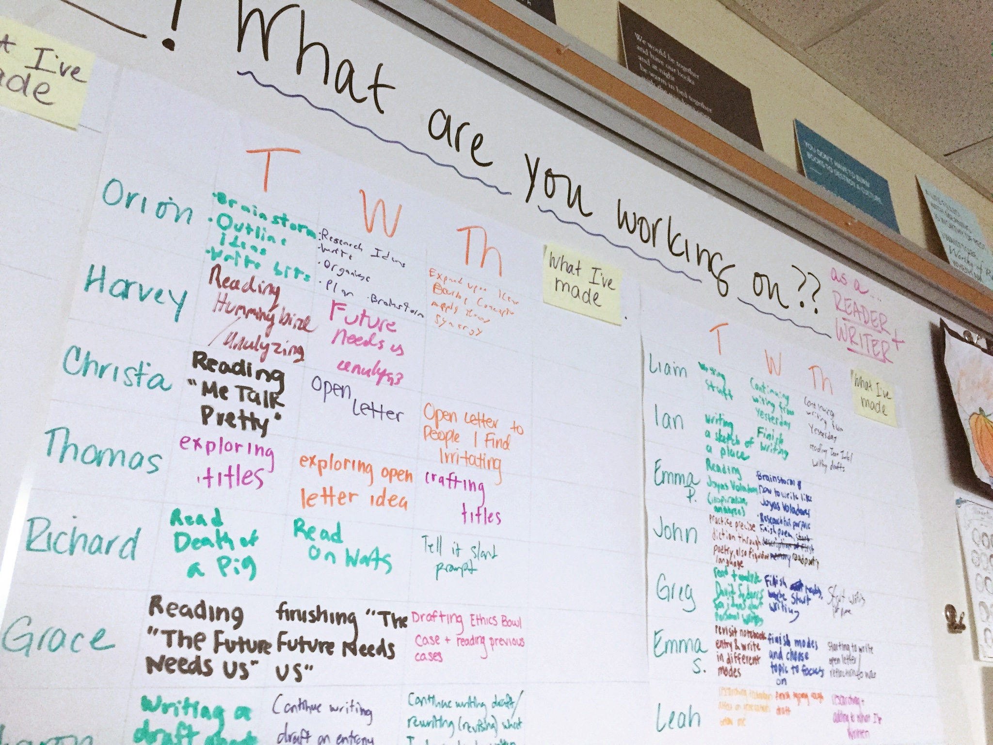 img_5351-1Outside my classroom, I post two questions that students see every time they walk into my room. 1) What are you reading? 2) What are your working on? I’ve been developing a robust independent reading program for several years now, and I feel confident that I’ve put students in the position to be able to answer the first question. But the second question has always eluded me a little. Until now.
