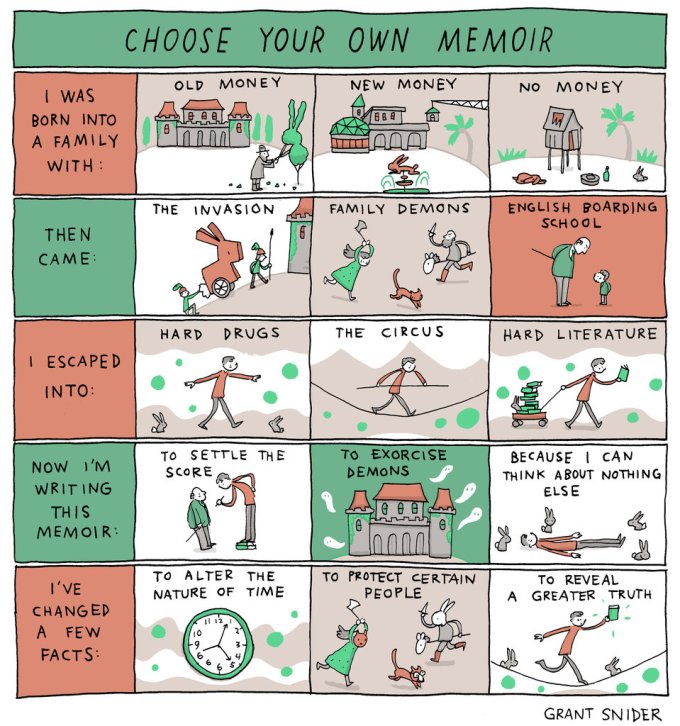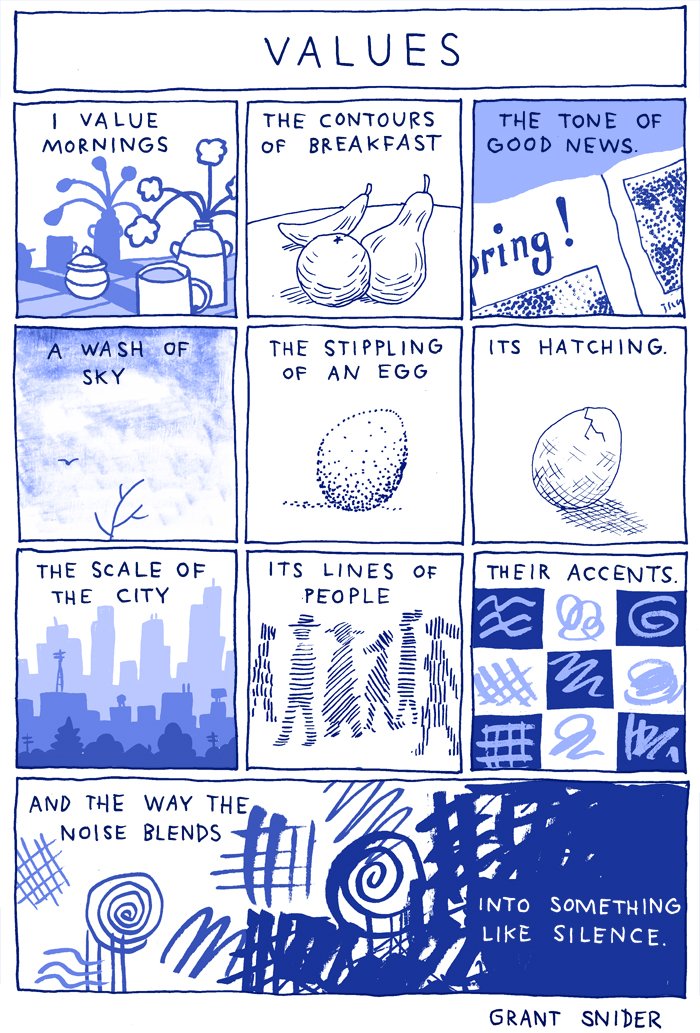Above, “Choose Your Own Memoir” offers an accessible and inviting way for students to write about themselves. It’s hard to write about yourself; any teacher who has helped students with college essays knows how true this is. The simple and direct structure of “Choose Your Own Memoir” can help students narrow down on key events or moments. In the storyboard below, it’s easy to see how you could write an essay about a particular row—for example, a descriptive piece on your family history, as in row 1—or even dive deeper into a single panel—for example, a narrative on the way books have been a way to escape, as in the end of row 3. And most importantly, as the last panel points out, as we write, what’s the greater truth we can or need to reveal? Likewise, Snider’s “Values” (below) could also inspire the type of self-reflective writing that could help students (it would be great to use as prewriting for college essays!).