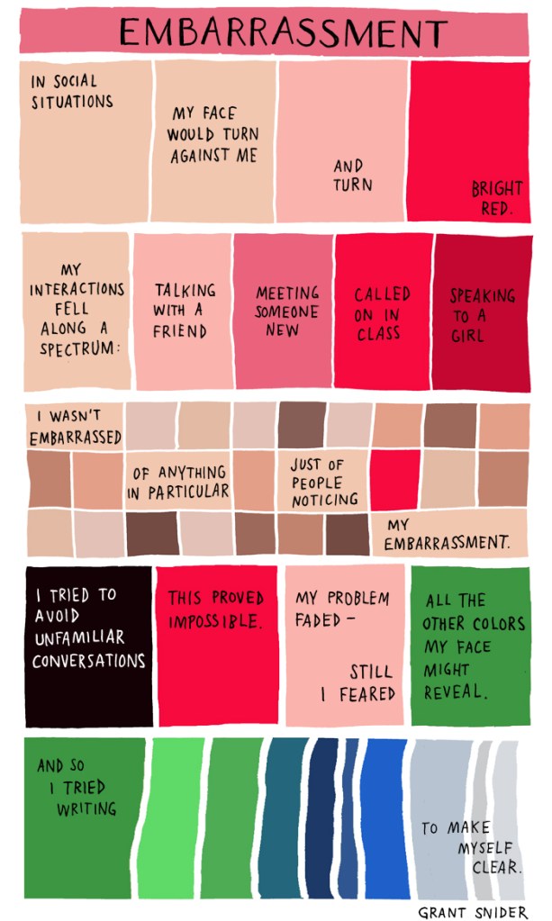 “Embarrassment” is another one of my favorites. We’ve all been embarrassed, and for students, their embarrassments tend to linger a little longer, sting a little harder. Snider’s “Embarrassment” could inspire students to think about those moments worth writing about. But beyond that, Snider’s playful use of color can also inspire further creativity. It would be great to grab some paint chips from the hardware store and ask students to think about how another abstract concept (like embarrassment) might be represented through color (I imagine shades of bright yellow for joy, or shades of blue for nostalgia).