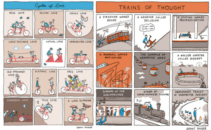 When I saw Snider’s “Cycles of Love” and “Trains of Thought” (above), I knew that they’d be wonderful to use to encourage students to not only think in terms of metaphor, but to also stretch their thinking and play with language. These two graphics, treated either separately or together, could help students think about how they might explain an abstract concept in more concrete, accessible terms for their readers.