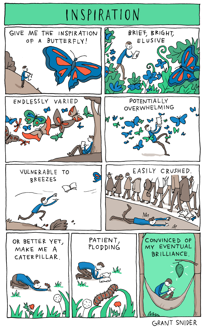 Open up to any page in The Shape of Ideas and there’s a wonderful notebook prompt waiting for you and your students. Any page. For example, I love Snider’s “Inspiration” (below) for so many different reasons—its poetry, its simplicity, its use of metaphor, its humor. I especially appreciate the way it represents inspiration as something that can be “brief, bright, and elusive” but also “patient, plodding.”
