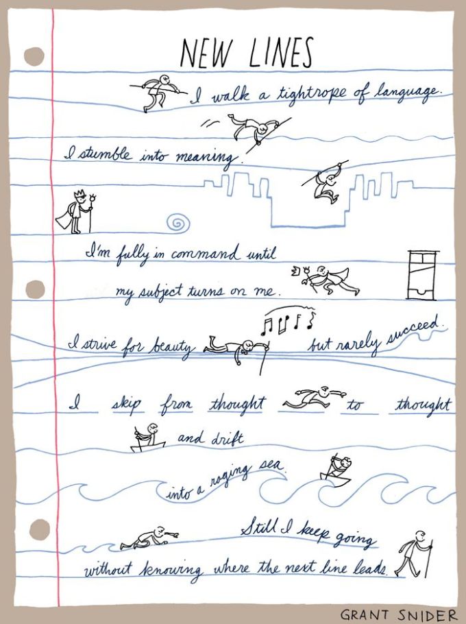 In “New Lines” (below), Snider beautifully captures this process. As writers, we sometimes don’t know where our writing and thinking will take us until we’ve written down a line, and then another line, and then another. We might sometimes “drift into a raging sea” or feel frustrated that as we “strive for beauty” we feel we “rarely succeed.” And that’s okay. Early in the year, I do an exercise where I ask students to write in their notebook without stopping for three minutes, then five minutes, then eventually ten minutes on subsequent days. I want students to see that sometimes their next best idea needs at least five, six, or even ten minutes to get to. My hope is to use “New Lines” to show students to embrace where their own lines take them, to trust the process, to “keep going without knowing where the next line leads.”