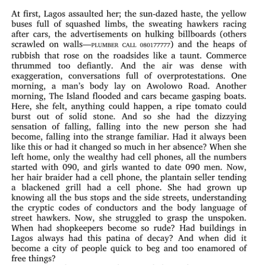 Likewise, here’s Adichie’s description of Lagos in Americanah: