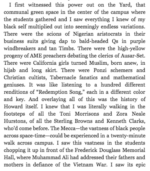 Again, strong verbs like assaulted and images of yellows buses full of squashed limbs stand out. So too do the questions and confusion, which also capture a sense of place—or, in this case, of displacement. In the following excerpt from Between the World and Me, Coates captures the place that is Howard University through its people in all their “seemingly endless variations”: