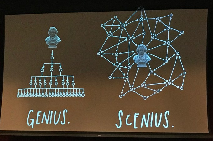 But Kleon points out that the idea of the “lone genius” is really a myth, that genius isn’t only a product of great individual talent, but a product of a what Kleon calls a “scenius”—a network of others inspiring artists and thinkers who inspire and push and help those individuals become the geniuses they become. All creative work is the product of a “scenius” or ecosystem (v. egosystem) of collaboration. We all have a family tree of creative influence—so the question is, how can we help create a “scenius” of influence and inspiration for our students.