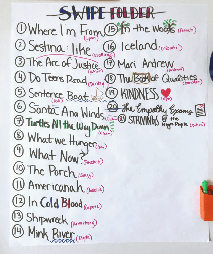 When my students were working on writing a piece about a meaningful place, we filled our swipe folders with mentor texts that were rich in vivid description and detail. When we were working on introductions, we looked at several opening paragraphs, and after annotating, we talked about what we discussed what direction the rest of the essay might go: Where does this introduction leave us? Can I predict what the next paragraph will be about? When we actually go on to read some of the full essays later, students are happily surprised to see a familiar text and are more eager to dive in and dig a little deeper because they’ve seen part of it before.
