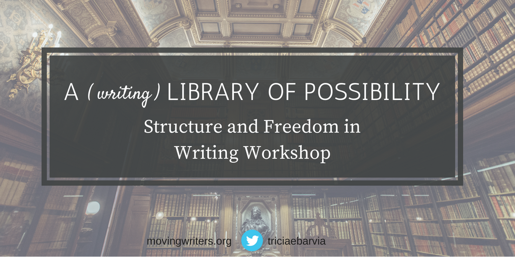 In the same way we build a library of choice reading for students, we can build libraries of writing possibilities. And just as we use book talks to introduce kids to potentially interesting titles to add to their TBR or “on deck” lists, we can also “book talk” writing prompts and mentor texts, too. During workshop, I begin each day of writing workshop by spending 5 minutes to share a writing prompt and/or a potential mentor text for study. Some kids run with it and immediately flash draft in their notebooks, while get right back into working on they had been doing before.
