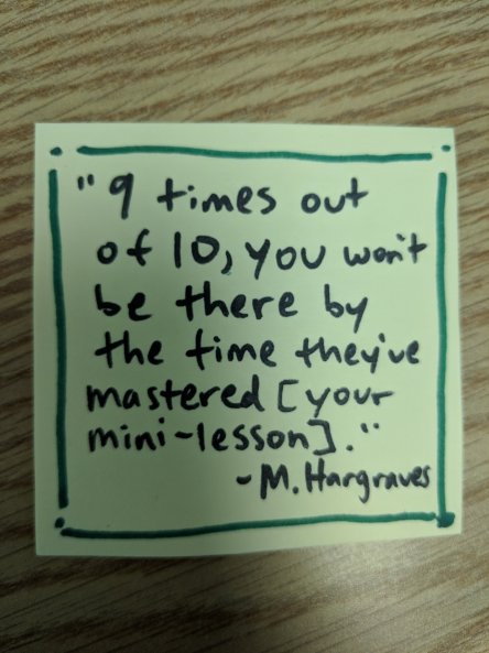 My mind went straight back to that recent mini-lesson flop. I’d been shooting for mini-lesson mastery instead of introducing a new skill to begin practicing.