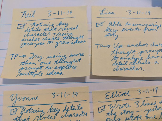 By using this sticky note method, before a subsequent meeting with a student, we can flip through our recent conferences to see what we had them working on the last time we chatted. This helps us avoid teaching something that the student already got before–it also allows us to check-in on how the student is progressing with the previous teaching point.