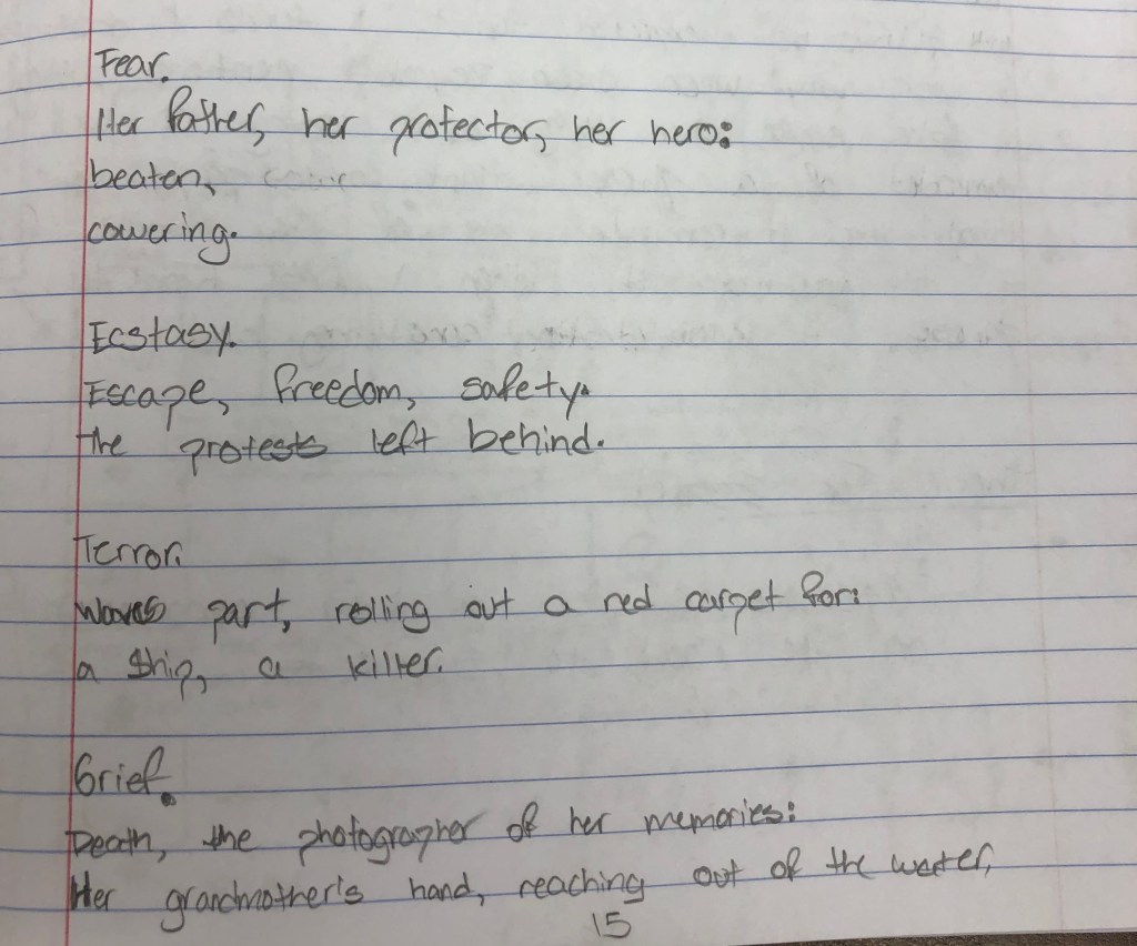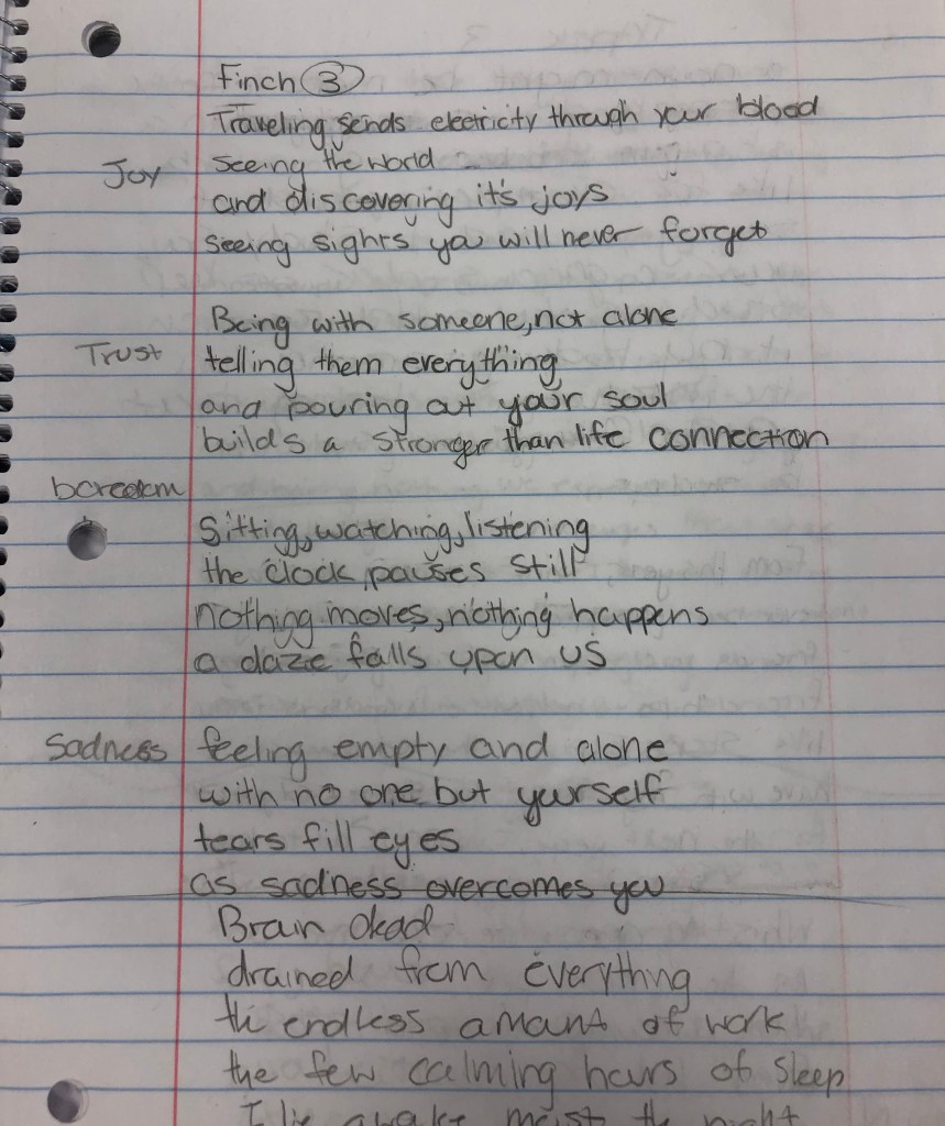 After students recorded their observations on the Plutchik wheel, they wrote a poem in four stanzas, capturing the changes in one of the characters they followed and providing slightly more context for that character’s emotional journey. Each point labeled on the wheel became its own stanza in the poem.