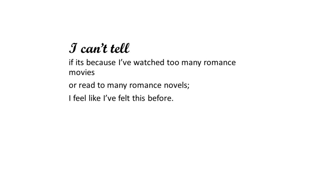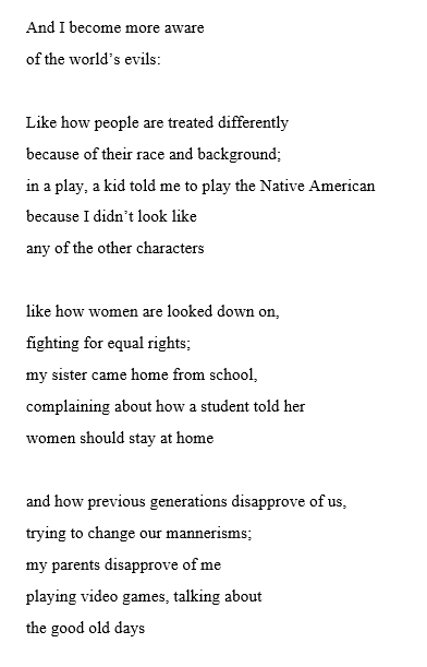 In drafting a poem that they needed to sustain over three pages, both Suraj and Dakotah ended up writing about some honest, personal, confessional ideas that travel far from where they began.  Poet Billy Collins sometimes speaks about the importance of poetry moving from Point A to Point B: These poems do that well.