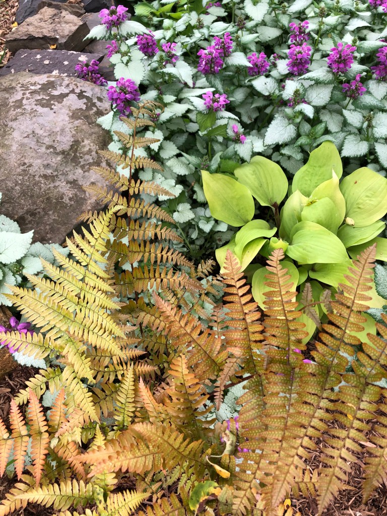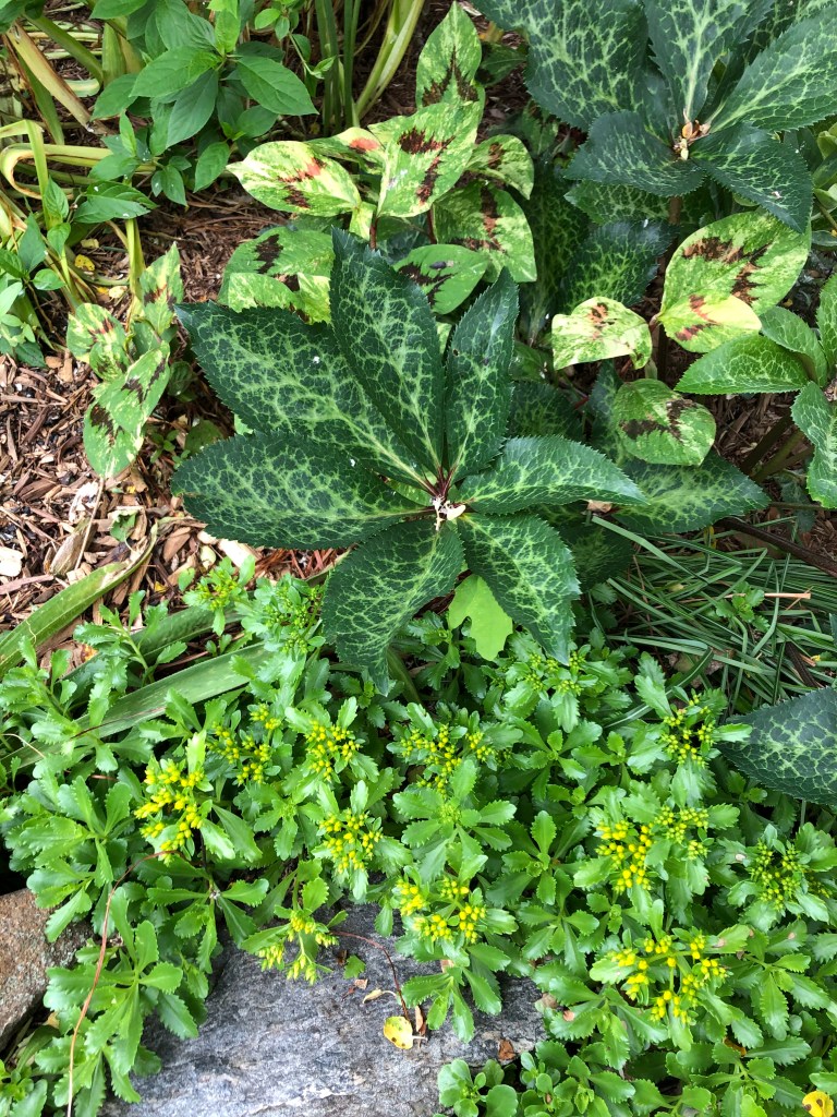 Just below the repurposed fountain, a hosta stretches it’s broad, leathery leaves. The form and color of the leaf mimics the metal behind it. The yellow stripes echo the sedum’s blond blooms above. None of that was planned.