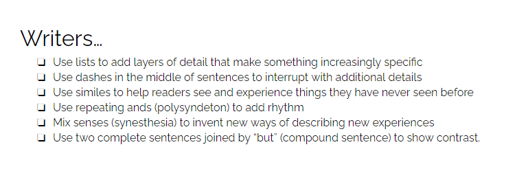 My eighth graders know this routine by heart. But I want to begin divorcing the writerly moves from that one, isolated passage and, instead, help students see these moves as techniques any writer might use in a variety of genres and for a variety of purposes.