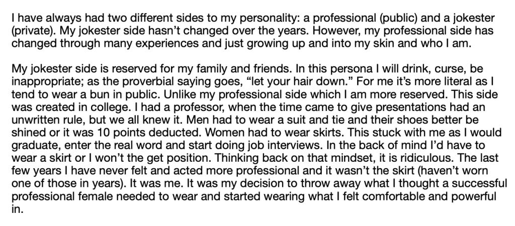 How do you present yourself depending on the social situation? For instance, consider how your personality shifts from school to home to social situations (both online and in person). For each facet of your personality, consider what previous experiences have created these differences in the way you present your personality. In what ways do you use your personality to avoid discrimination, protect yourself (or others), or seek acceptance?
