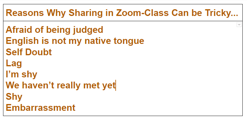 I re-shared our sign-in sheet, and under our sign in, I created a 1-column table entitled “Reasons Why Sharing in Zoom-class Can be Tricky”. I asked students to just type whatever came to mind into the table. Here’s what they said: