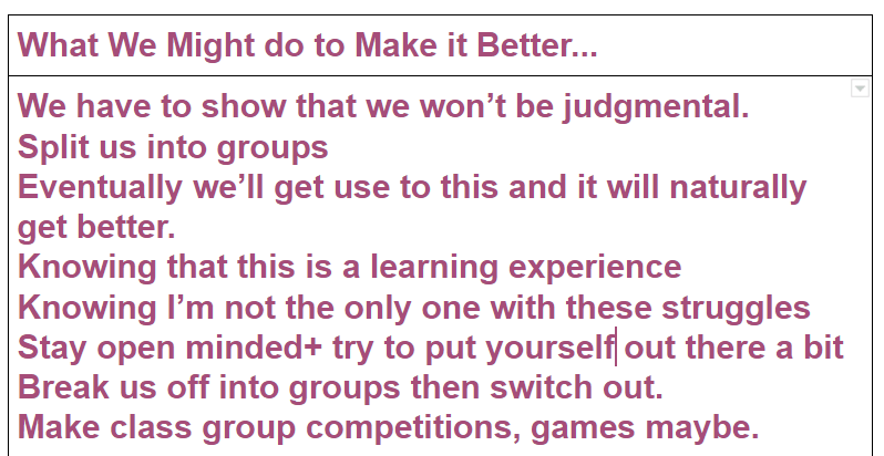 After class was over, I studied their responses to think of things I might try on my end. Obviously, breaking people into small groups would be an easy starting point. I also needed to create opportunities for students to show that they (and I) wouldn’t bite if somebody shared something that was embarrassing.