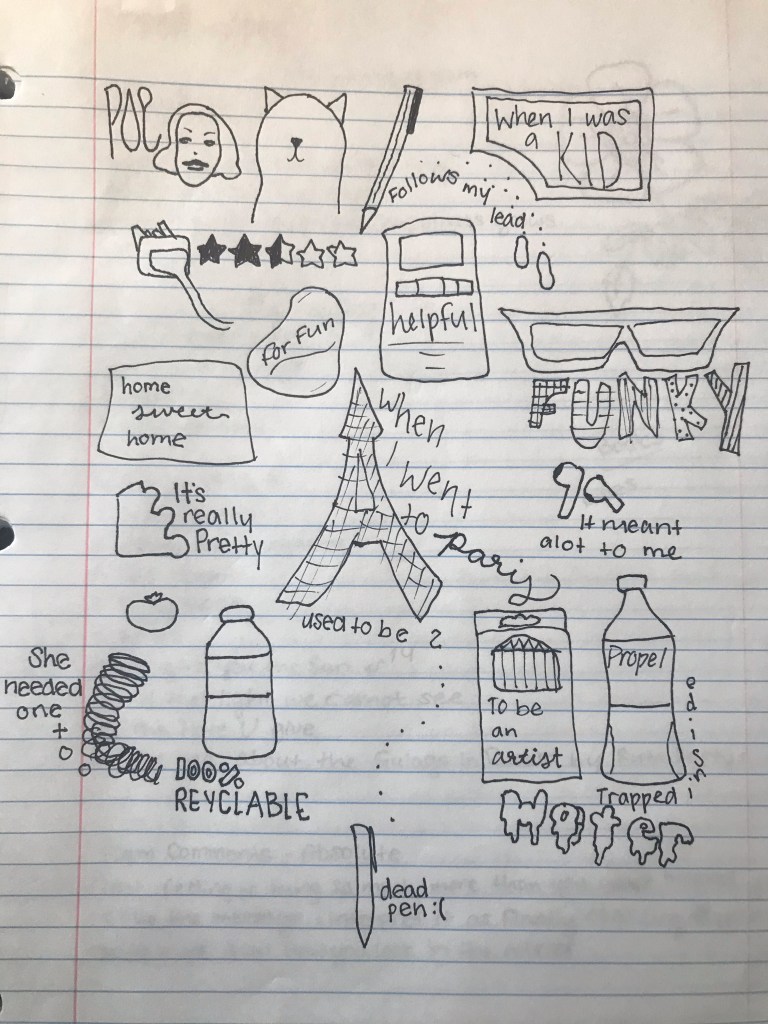 I also added a writing component. We would create sketchnotes while listening to each other’s sixty-second speeches. I told them, “Collect images and words that stand out to you while we listen. Think on paper in your Writer’s Notebooks. Avert your eyes from the screen and practice tuning in to what someone is actually saying.”