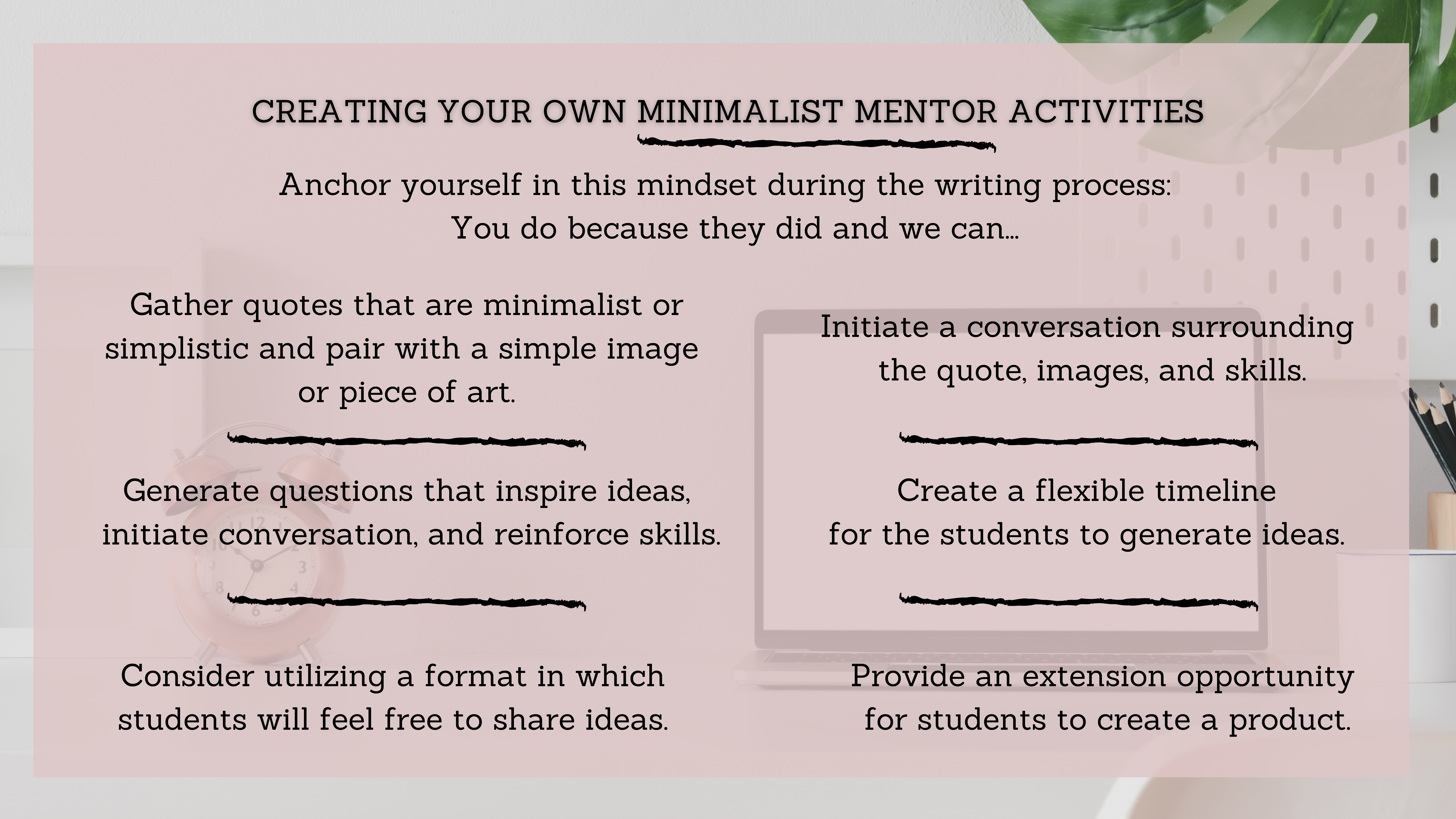 While you read, feel free to stop to write to get a feel for how these activities might feel as a student. While drafting ideas, reflect on your own practices to consider ways in which you may be able to simplify something but maximize its purpose. If you already use mentor texts, consider ways in which you might be able to effectively utilize minimalist mentor texts and art in similar ways.