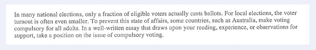 Considering the importance of citizenship, I asked students to think about the topic of compulsory voting and uncover its implication of liberty, of democracy, and of pragmatism. All of a sudden, this was no longer just about the diagnostic writing, but a timely and relevant moment to think and reflect authentically.