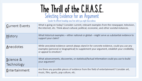 I especially focused on encouraging students to consider the vast pool of evidence from which they can choose; students were surprised to realize that even without research, their knowledge from other courses, the newspaper, and the world as they know it came in quite handy.