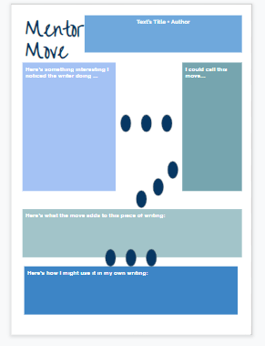 • Before a chunk of in-class independent reading time, give students the organizer above + ask them to be on the lookout for a mentor move as they are reading right now.