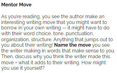 I’ve tossed a new kind of reading response into our mix to help students consistently read with an eye toward writing moves: a Mentor Move Reading Response.