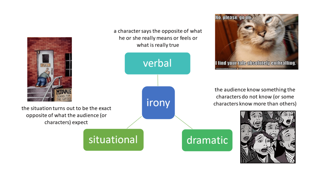 Throughout the play, we studied the definitions of three different types of irony, and we discussed examples as we read. The visual aid below served as an anchor each time we discussed ironies in the play. And with a cartoon from The Far Side and a cat meme, what’s not to love?
