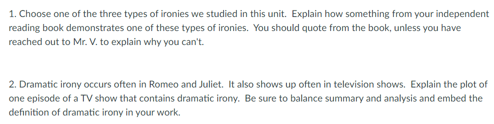 There were two other small summative assessments in this unit. Students recorded an oral interpretation of a short scene in lieu of my usual performance component. They took a short quiz that emphasized cause and effect and grilled them on iambic pentameter. But surprisingly, my favorite of these mini-assessments and the most revealing, was their pair of short writing responses about irony.