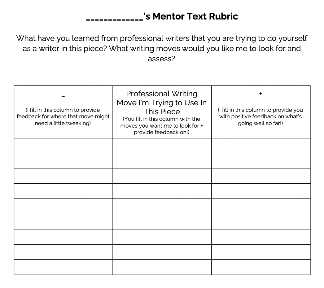 I do this by giving students a blank mentor text rubric. They copy + paste the rubric chart at the bottom of their draft — this way, they can add the different writing moves they are using as they crop up.