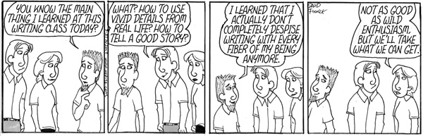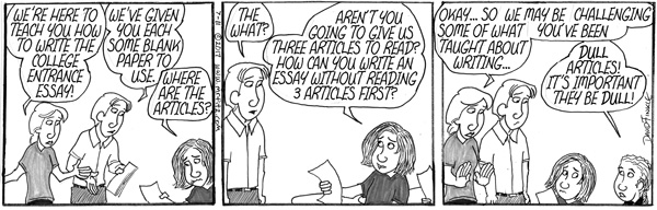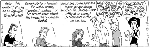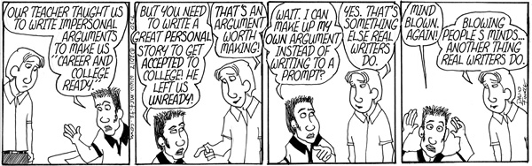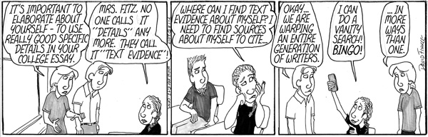 My wife and I have been teaching at the same schools for a good chunk of our careers, first at a middle school and now at a high school. She had been a character in my comic strip, Mr. Fitz, before she became a teacher later in life than I did, so of course Mrs. Fitz became a teacher as well. A few years back, an administrator asked if we would run a class for high school juniors who were in our Take Stock in Children Program. We would be teaching them writing techniques to write a successful college admissions essay.