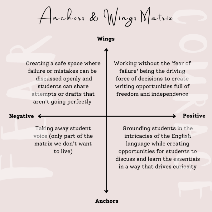 This month, let’s spend some time discussing what it might look like for us to spend out instructional time in the other three quadrants: Negative Wings, Positive Wings, and Positive Anchors. All of these activities stem from risks I have taken in the classroom but also focus on connecting with students through my journey with the English language. These examples and instructional strategies are not exhaustive, but reflect my experiences with teaching writing, so I encourage you to fill in your own matrix and consider what has given you courage to work through the fear of writing or what you and your team can do to help students work through the fear of writing.