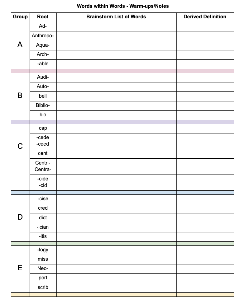 - Compile those prefixes, suffixes, and roots into a list for the students to uncover in a warm-up activity