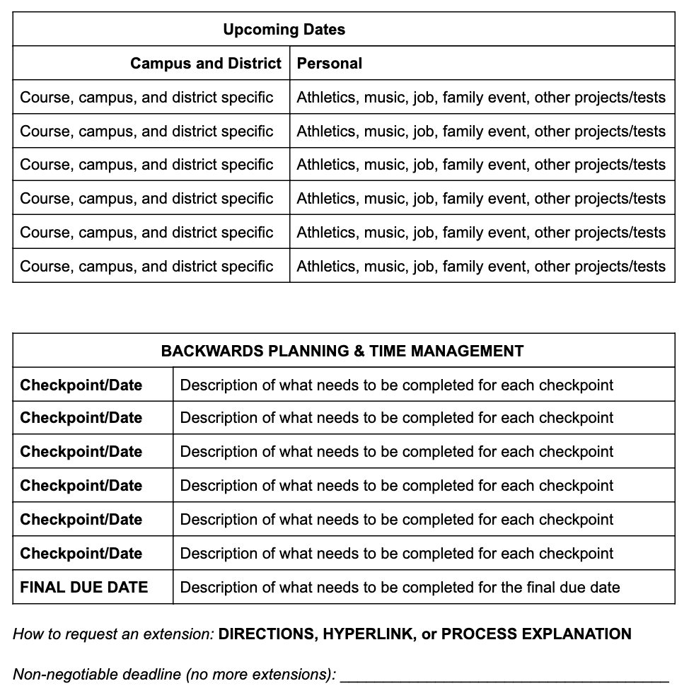 - have students backwards plan and set daily or weekly goals for what they need to accomplish in order to finish the project according to their own due date