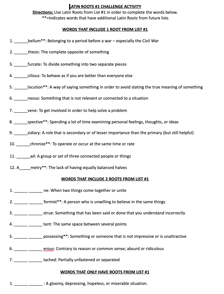 - Each day, students have four or five roots (or prefixes and suffixes) that they must come up with words that contain those roots, prefixes, or suffixes
