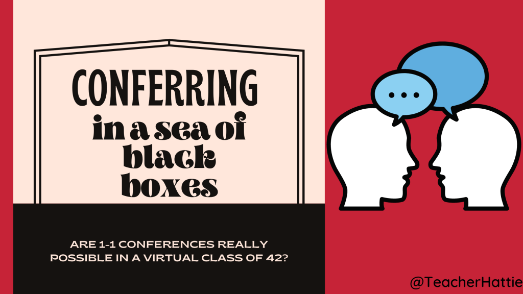 My next step was brainstorming how to use written feedback more strategically. I even wrote about it last month! That definitely helped me rethink how to approach such a large virtual class, but I still wasn’t ready to give up on one-on-one conferring. So I dove in last week, determined to knock out 42 writing conferences in four 50 min class periods.