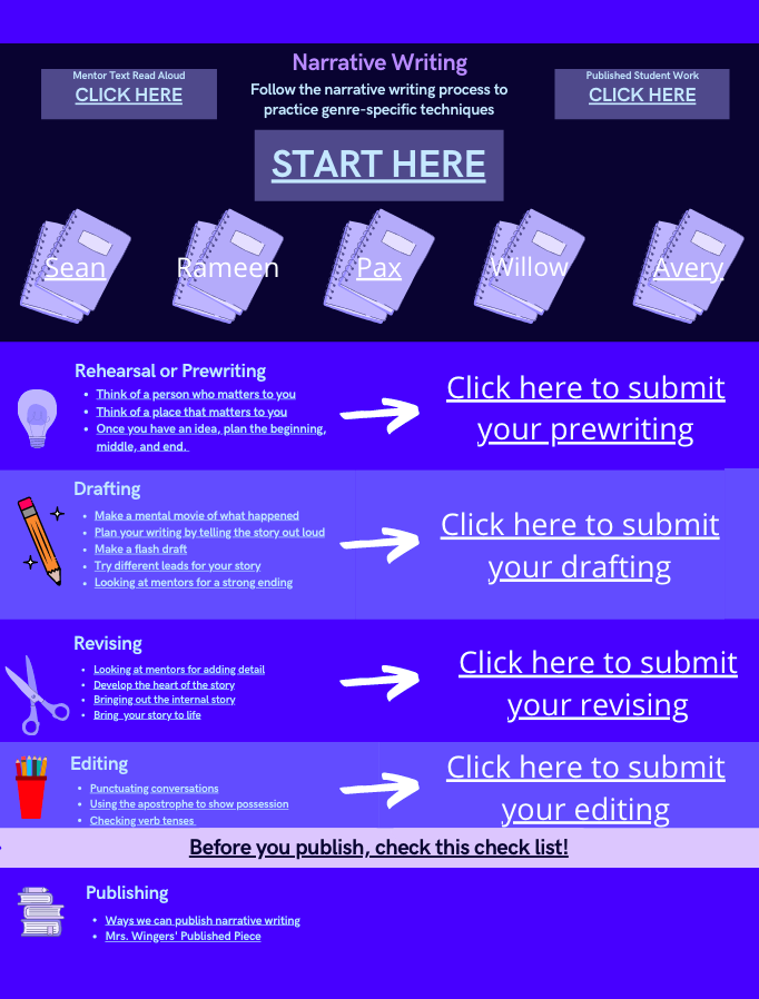 - Self-pacing — students were given a mini-lesson menu; they could choose what they wanted to learn about for each part of the writing process.