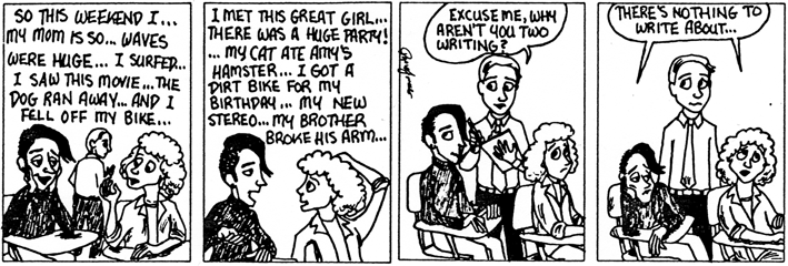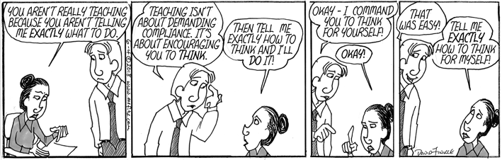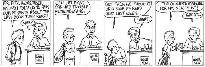 I have never had anyone hand me a rubric for comic strips. I read models voraciously – Peanuts, Calvin and Hobbes, Bloom County – and then I re-read them. And I took what I learned from them and my own experiences and created something that I hope is interesting. I didn’t follow someone else’s rule book. I made my own: Every strip has to be about teaching or learning, or reading and writing, or teachers and students in some way.