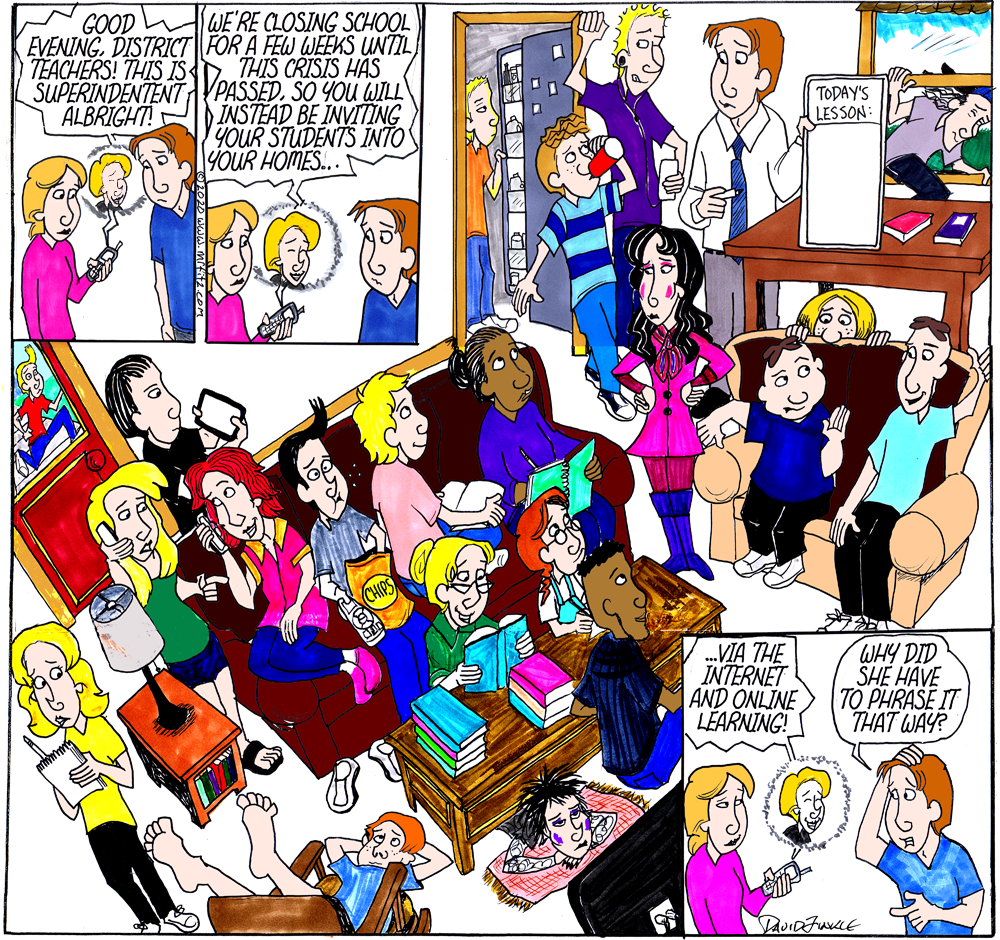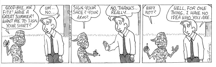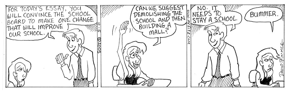 When I get impatient with my student writers, I simply need to open my file drawer of comic strips and go back to year one in 2000. My cartoons had some merits back then, but technical savvy and a professional drawing weren’t among them. I drew with gel pens on copy paper, and my style was wildly inconsistent. If you look at the strip below, Mr. Fitz’s head changes shape and size, and his features drift around his face. He is almost a completely different character in each frame, visually. Despite my somewhat lackluster drawing, however, my need to say something was strong, though, and so the ideas were often good. And I had landed a spot in my local newspaper, so I had to say something five times a week, and a few years later, six times a week. So I just kept writing and drawing. It became my professional therapy.