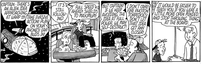 I have never had anyone hand me a rubric for comic strips. I read models voraciously – Peanuts, Calvin and Hobbes, Bloom County – and then I re-read them. And I took what I learned from them and my own experiences and created something that I hope is interesting. I didn’t follow someone else’s rule book. I made my own: Every strip has to be about teaching or learning, or reading and writing, or teachers and students in some way.